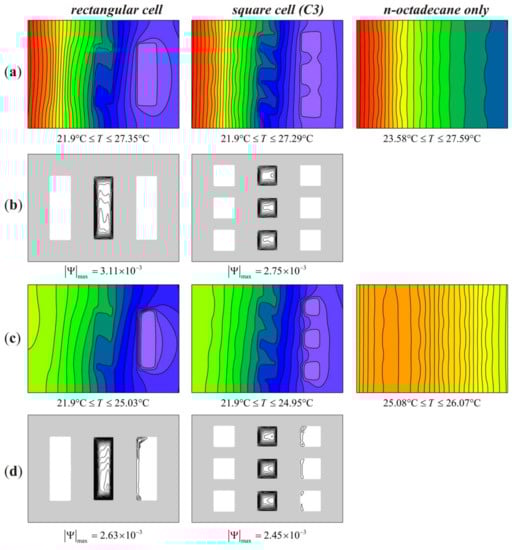 Figure 7 details the temperature fields and streamlines in PCM enclosures under ambient temperature conditions defined by the function . Of the cases presented, melting occurs in C3 configurations with square and rectangular cells. In the case of single–PCM brick, where all the cavities are filled with n-octadecane, the paraffin remains in a solid state throughout the cycle. In this regard, the brick warms up faster than in multi-PCM brick, so the observed minimum temperature is higher by 1.68 °C at the time of t = 6 h and by 3.18 °C at the time of t = 10 h. Thus, in the model without phase transitions, a higher temperature is observed everywhere. In multi–PCM bricks, the middle layer of PCM, namely RT18, was in the liquid state at the initial time.