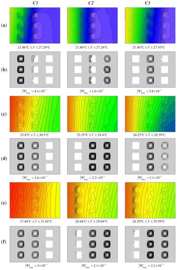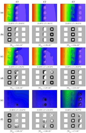 Figure 8 presents the temperature distributions and isolines of the stream function for a block of 10 cm × 14 cm with a temperature increase of 15 degrees in 6 h. The largest temperature difference in the domain is observed at peak external temperatures and amounts to 8.36 °C. The maximum values of the stream function will be observed where the most melted material is closer to the outdoor. Therefore, at times t = 6 h and t = 8 h, the largest value is observed in the case of C1. In bricks C1 and C2, RT22 takes the middle position and melts almost throughout the entire time period.