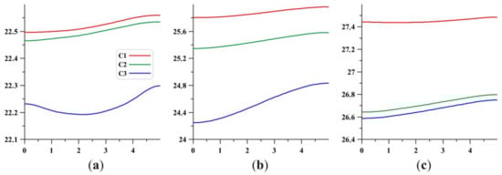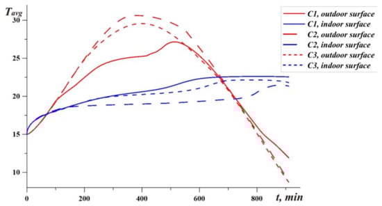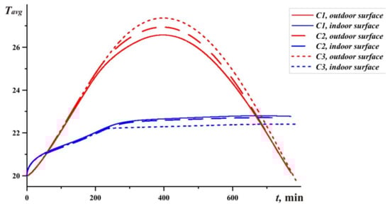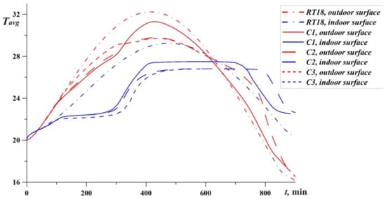 From Figure 9, it can be seen that an increase in ambient temperature, even by 10 degrees, shows a significant difference in the efficiency of models C1, C2 and C3. As noted earlier, the lowest temperature of the outdoor surface shows the C1 configuration due to natural convection near the boundary; the temperature difference reaches 0.79 degrees, compared to C3. Also in configuration C1, the highest temperature of the inner surface is noted to be slightly higher than C2. From a cooling point of view, the most effective is the arrangement of materials when RT22 is closer to the room, the advantage being, in this case, the surface temperature was 0.61 degrees, and at the same time, higher temperatures of the outdoor surface are observed in this model, therefore, this is the least intensive heat exchange with the environment and the smallest amount of accumulated thermal energy.