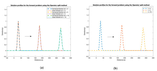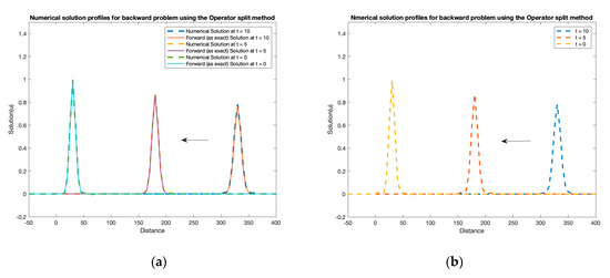 This paper shows how to construct a stable operator-splitting method to study a backward advection–dispersion problem. The beauty of the method is that there is no computational error for the advection portion of the calculation. In addition, if the spatial mesh width is chosen optimally, the computational error for the dispersion part could be held within an acceptable bound. With respect to the contaminant transport problem, the numerical simulations presented in Figure 2, Figure 3, Figure 4 and Figure 5 provide evidence that our operator-splitting method can track back the contaminant profile successfully and reliably. Additionally, they highlight that the operator-splitting method is effective, and the error of the numerical solution can be reasonably bounded with an appropriate choice of . Interestingly, the error seems to decrease at the beginning stages before creeping up a little. It should be pointed out that in order to validate the operator-splitting method further, we carried out a number of numerical simulations for and with , respectively, and found that the method is effective and robust for appropriate choices of mesh width and time step.