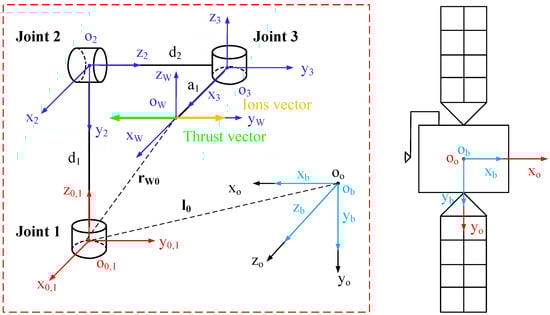 The coordinate system OoXoYoZo is the spacecraft orbit coordinate system, and the spacecraft body coordinates system ObXbYbZb origin coincides with the spacecraft orbit coordinate system OoXoYoZo in this scheme. The coordinate system O0X0Y0Z0 is the base coordinate system of the gimbaled thruster boom, and the relative position vector between its origin and the origin of the spacecraft body coordinate system ObXbYbZb is l0. OiXiYiZi (i = 1, 2, 3) represent the three linkages coordinate systems of the gimbaled thruster boom, respectively. The thruster is mounted along the X-axis direction of the spacecraft orbit coordinate system OoXoYoZo. The joint lengths of joint 1 and joint 2 are d1 and d2, respectively, and the joint 3 linkage length is a1. The position vector of the origin of the wrist coordinate system concerning the origin of the base coordinate system.