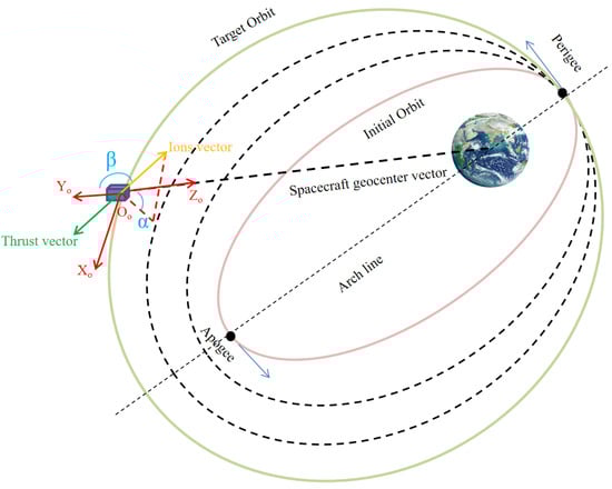 During the thruster start-up process, the thrust direction is divided into two directional components: the orbital and the out-of-orbit planes. The thrust control angle α is defined as the angle between the projection of the ions vector in the orbit plane and the direction of the spacecraft geocentric vector in the orbit coordinate system, with the ions vector pointing in the radial direction being positive. The thrust control angle β defined as the angle between the ions vector and the orbit plane, and the ions vector pointing to the direction of the spacecraft angular momentum is positive. To facilitate the study, the coupling between the inside and outside of the orbit plane is ignored in this paper, and the analytical solution of the thrust control angle is defined as follows: