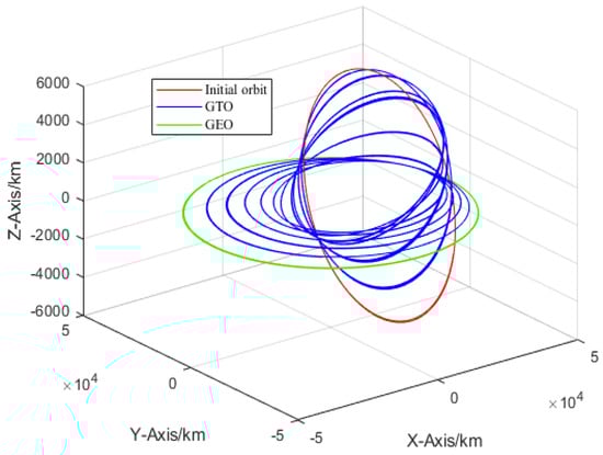 The geostationary orbit (GEO) is a special type where spacecraft have the same Earth’s rotation period around its axis [1]. The GEO is significant in promoting the development of the economy and space technology. Currently, there are several ways to deliver satellites into GEO orbit. Some launch vehicles can deliver payloads directly to GEO, but this requires the rocket to carry a huge amount of fuel, which also imposes limitations on the size of the payload. Therefore, for most missions, the launch vehicle launches the satellite into a Geostationary Transfer Orbit (GTO) and separates from the satellite. The orbiting process from GTO-GEO is then accomplished by an onboard chemical propulsion system [2]. However, it requires GEO spacecraft to carry a significant amount of fuel, which limits the size and mass of the payload [3]. GEO spacecraft has recently developed towards a high load-bearing ratio and long life. Therefore, many scholars have extensively researched electric propulsion technology to replace traditional chemical propulsion technology to realize the orbit transfer task of GEO orbit spacecraft [4].