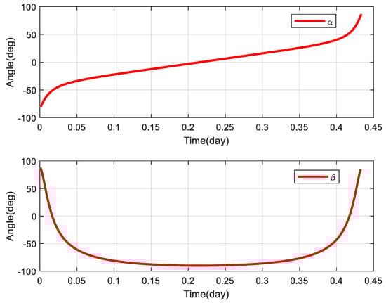 As can be seen from Equation (1), the values of thrust control angle α and thrust control angle β are related to the satellite’s true proximity angle, and the thrust control angle in a single cycle is given in this paper considering that the trend of their changes is the same in each orbital cycle (Figure 6).