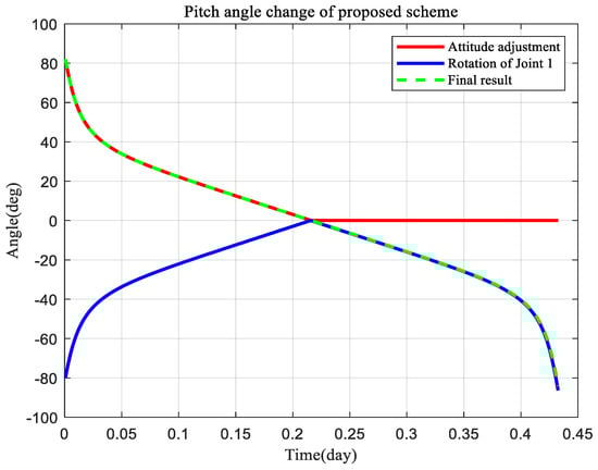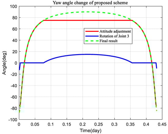As shown in Figure 11, it is joint 1 and joint 3 that need to be controlled for planning, and joint 2 remains unchanged. From Equation (2), we can see that the joint 1 turning angle corresponds to the -y axis and the joint 3 turning angle corresponds to the -z-axis, and the thrust vector during the GTO-GEO transfer is changed by adjustment. Also, we can notice that their changing trends are consistent with Figure 8 and Figure 10. Next, in this section, the planning allocation simulation analysis of the gimbaled thruster boom is performed by the planning algorithm designed in Section 3.