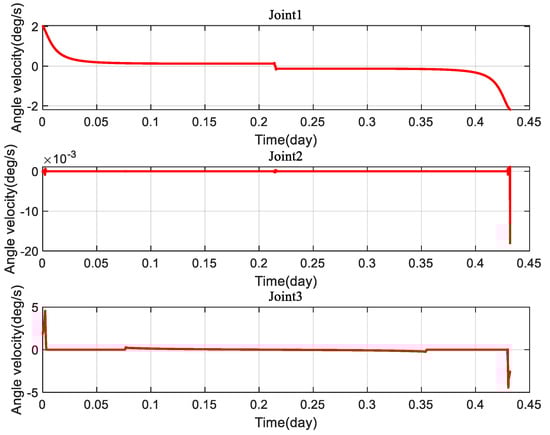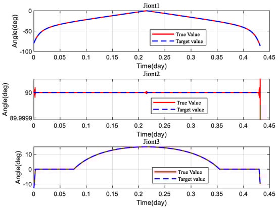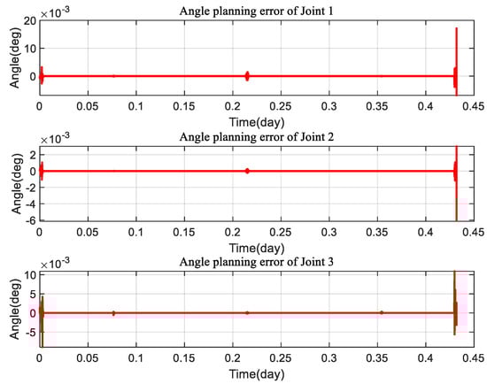 As can be seen from Figure 12 and Figure 13, the three-degree-of-freedom gimbaled thruster boom can accomplish the required angle change requirement by the proposed MPC planning control method. It is noteworthy that joints 1 and 3 reach the peak angle change simultaneously during the 0.2–0.25 days period, after which the planning direction becomes reversed. Since the MPC planning process is a simultaneous three-axis planning, joint 2 is affected by a certain coupling effect at that moment, but the change angle error is only 10−5, which is acceptable.