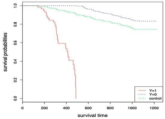 instead of in model (2). The estimates of the corresponding parameters and which are same as in (2) and (3) can be obtained via the EM algorithm such as in the cured models ([22,23]). Of course, the estimators and are dependent on the given time point .