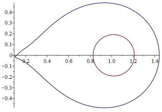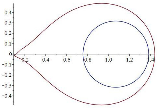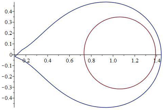 of the MAPLE™ computer software, we obtain the image of the boundary by the functions Θ, Λ, and , presented in Figure 4. Since the function is univalent in , the subordinations and hold because , and (see Figure 4). Hence, ; therefore, the class is not empty and contains other functions besides the identity. In the following theorem, we determine the results for the initial coefficient bounds of the class .