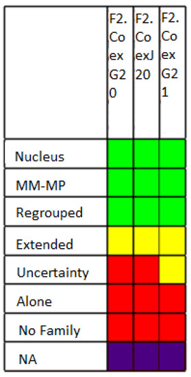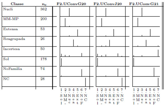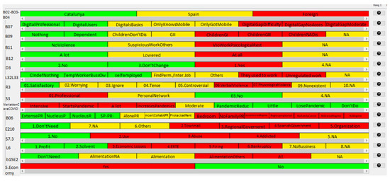 In the TLP described in Section 2.4, only 3 colors are shown. Red always represents negative or bad values, yellow represents neutral or medium values, and green represents positive or good values. Therefore, in the original TLP, the associated uncertainty (measured by the variation coefficient) associated is omitted, and related ambiguities appear. Ref. [34] presented annotated TLP (aTLP) to improve the interpretation of TLP. Building aTLP requires the quantification of the homogeneity of the local distributions inside the classes because the tone of the color changes as a function of the heterogeneity. Therefore, a darker cell represents higher heterogeneity among the class individuals in that variable, and more uncertainty about the standard behavior of that variable in that class is propagated. Therefore, the darker an aTLP is, the higher the uncertainty related to the final profiles is; also, purer colors appearing in a TLP indicates that less variability in the central tendency of the variable is present. A color-based model for the automatic calculation of the saturation of each color is presented in [27].