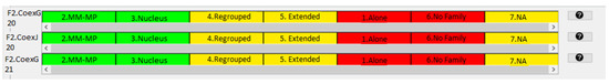 By convention, due to the strong relationship that this visual model maintains with traffic lights, only a maximum of three zones with the colors red, yellow and green are allowed, and violet is used for missing values. This restricted model with three colors is oriented to take advantage of all implicit interpretation codes associated with traffic lights so that the concept’s induction from the analysis results is empowered. The colored areas are arranged in such a way that: