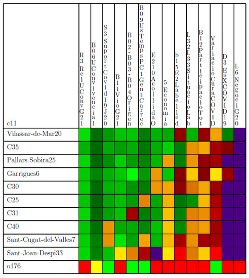 The selection of the representative variables for each original thematic block of the survey to be inputted in the territorial clustering process requires new criteria, which were developed and presented in Section 2.6.4. The territorial feature selection method proposed in this paper is shown to provide a better grouping of BASS than previous works [1]. The comparison of the resulting clusters shows how the explainability of the clusters obtained with TFSM is higher than those obtained in [1] according to the SP criterion. Additionally, the visualization of the obtained clusters over maps (Figure 15 and Figure 16) shows more cohesive groups in the TFSM clustering, where several similar BASS are grouped together in a class, achieving one of the goals of the paper: clustering similar territories. The main clustering conclusions are the following. From the 11 clusters obtained, 5 represent a single BASS, and the other 6 groups represent between 4 and 11 BASS in larger groups with similar characteristics. The BASS clusters can therefore range from a single BASS (class Sant Joan Despí), which comprises people with good coexisting situations but many needs and precarity regarding their position in the economy and their working conditions, to the Vilassar class, the members of which enjoy better conditions regarding coexistence, their living situation, the economy, and challenges regarding social subsidy access and participation in the community. This can be observed by a gradation of intermediate clusters where gradually, emotional support is less needed, economical support improves, or working conditions improve. The patterns elicited in this analysis are extremely useful to understand the special situation of immigrants (C31, distributed through 5 BASS with economic problems, working needs, and difficulties in participating in the community) or other patterns that could be connected with the activation of new specific protocols to attend to special vulnerabilities. Additionally, the results were published within a few days of data collection closing thanks to the powerful data science methodology designed in the INSESS-COVID system.