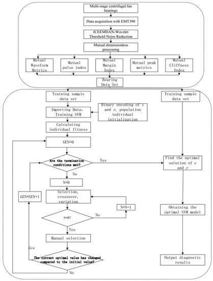 Multiple swarm genetic algorithms can effectively search for the optimal values of key parameters c and r, which affect the classification performance of SVMs to obtain the optimization model of SVM. Hence, the methods mentioned in Section 2 are fused. Then, a bearing fault diagnosis method based on the combination of the ICEEMDAN-wavelet threshold, mutual dimensionless index and MPGA-SVM is proposed and experimentally validated using a dataset of petrochemical rotating machinery bearings under different fault states.