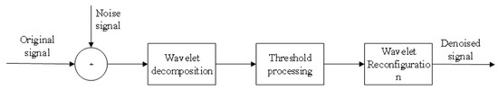 Wavelet threshold denoising is a very widely used signal noise-reduction processing method. First, the original signal is decomposed into a series of wavelet coefficients. Second, a threshold is applied to each wavelet obtained after the decomposition; when the wavelet coefficients are below the threshold, they are considered noise to be eliminated. Finally, the wavelet coefficients after wavelet threshold processing is completed are reconstructed to obtain the noise-reduced signal. The principle of the method is shown in Figure 2.