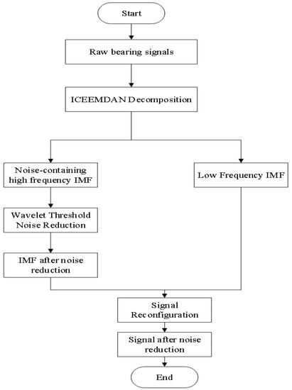 - Part 1: A joint ICEEMDAN-wavelet thresholding based noise-reduction method. In this paper, a signal noise-reduction method based on the joint ICEEMDAN decomposition algorithm and wavelet thresholding is proposed to establish a bearing vibration signal noise-reduction model. After the bearing signal collected in the field has been decomposed by ICEEMDAN, the IMF components arranged from high frequency to low frequency are obtained; the method only denoises the high-frequency IMF components that contain more noise by wavelet threshold and retains the low-frequency IMF components that contain less noise; finally, the high- and low-frequency IMF components are reconstructed.