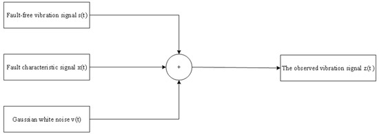 Let the collected rotating machinery bearing fault observable vibration signal be , which is composed of the fault-free vibration signal , bearing fault characteristic signal and Gaussian white noise . The fault-free vibration signal is the fault-free vibration signal collected by the sensor at the early stage of operation of the new rotating machinery after break-in. Figure 4 shows the combined model of the observable vibration signal .