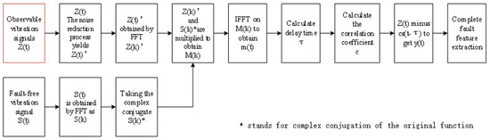 Fault feature extraction takes the observable vibration signal and fault-free vibration signal as the starting point and performs fast Fourier transform (FFT) on them to obtain and in the frequency domain. Then, the method takes the complex conjugate of . The correlation function in the frequency domain is the product of and . Then, the method performs a fast Fourier inverse transform (IFFT) on , and their correlation function in the time domain can be obtained. Afterward, the correlation coefficient c is calculated by correlation analysis of the delay time . Finally, is obtained by linearly subtracting and to complete the fault feature extraction. Where is the amplitude probability density of fault characteristic signal and is the amplitude probability density of non-fault vibration signal . The definition of the mutual dimensionless index is shown in Equation (8).