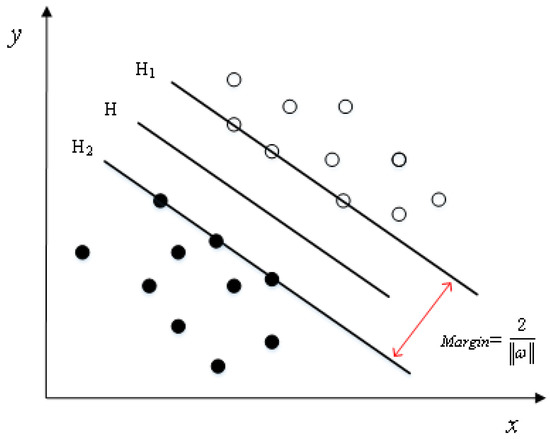 In solving the classification problem of linear data samples, SVMs establish classification surfaces at relatively distant locations from the two types of samples. In solving the classification problem of nonlinear data samples, the SVM transforms the low-dimensional nonlinear classification problem into a high-dimensional spatially divisible one by performing a high-dimensional spatial transformation through the kernel function and effectively classifies linearly indivisible samples. In other words, it aims to find a hyperplane to partition the data samples with a partitioning principle of interval maximization. Figure 6 shows the SVM classification surface.