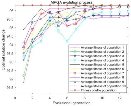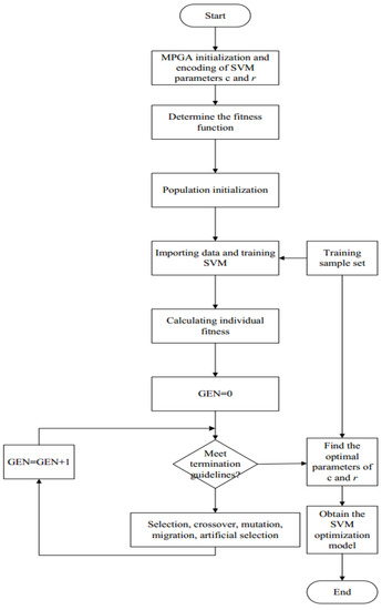 - Migration and manual selection: The migration operator is set to control the linkage between subpopulations, introduce the optimal individuals into the next subpopulation, make the linkage between subpopulations, and find the optimal result by co-evolution. The elite population is formed by manually selecting the best individuals in each generation to protect the optimal solution. The minimum number of generations of elite individuals is used as the termination condition of the algorithm. Figure 8 shows the flow chart of the MPGA-SVM algorithm.