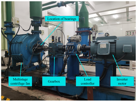 This paper focuses on the bearings of multi-stage centrifugal fan parts. The power supply adopts a three-phase alternating current and is connected to the inverter through a three-phase gate switch. When the three-phase gate switch is closed, the inverter motor is energized, runs and is connected to the fan through the coupling, load controller, gearbox and fan; thus, it drives the entire multi-stage centrifugal fan fault diagnosis unit to run. The experimental platform can simulate various multi-stage centrifugal fan rolling bearing fault states such as bearing inner ring wear, bearing outer ring wear and bearing’s lack of the rolling body. Figure 9 shows the petrochemical multi-stage centrifugal fan fault diagnosis platform.