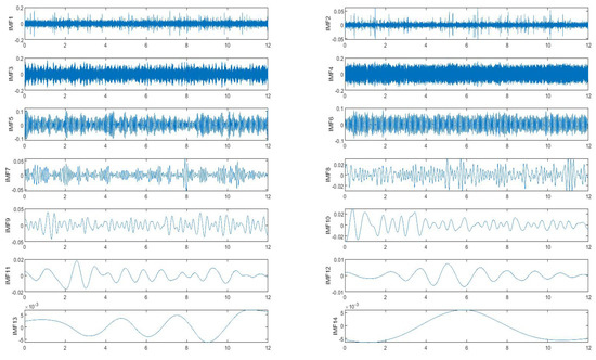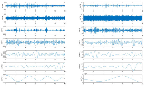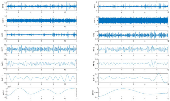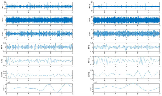 The parameters related to the ICEEMDAN method are set as follows: the standard deviation of the added Gaussian white noise Nstd = 0.2, Number of times noise is added NR = 100, Maximum number of iterations MaxIter = 200. The bearing signals acquired in the experiment were decomposed by the ICEEMDAN method, and the results are shown in Figure 11, Figure 12, Figure 13 and Figure 14.