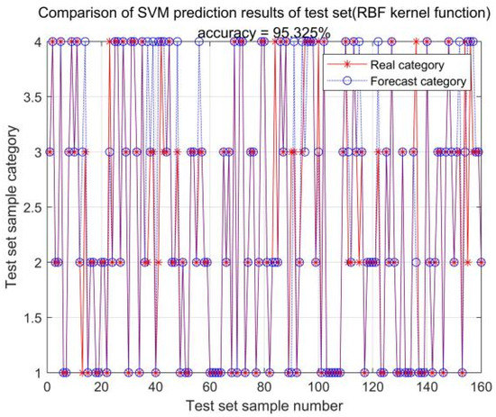 Among the data samples, 50% (160 groups) are selected as the training set to train the SVM model, and the remaining 50% (160 groups) are used as the test set of the MPGA-SVM model. The optimized MPGA-SVM model is obtained by seeking the SVM parameter penalty factor c and kernel parameter r through the parallelism of MPGA and the powerful global search capability. The performance of the MPGA-SVM model is verified. Figure 15 shows the MPGA-SVM evolution process. Figure 16 shows the experimental results.