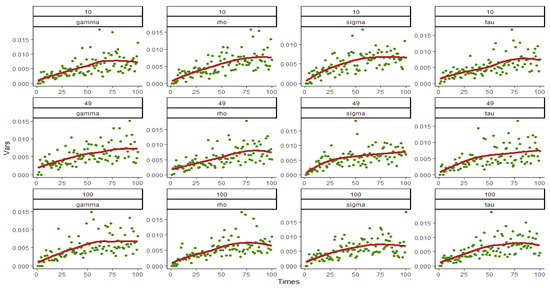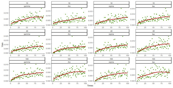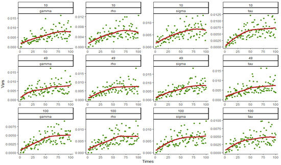 Figure 1, Figure 2, Figure 3 and Figure 4 show the variances and fitting curves of each parameter component in and under various combinations of and , where the horizontal axis is the number of simulation 0~100 and the vertical axis is the variances. The green points in the figure are the variances obtained from each simulation, and the red curve is fitted out from 100 variances. It can be clearly seen that when and 49, the variances of the estimated value of each parameter are distributed in , most of which are less than 0.01, and a minority of them are between 0.01 and 0.02. When , the variances are all less than 0.015, indicating that the overall fitting error is small. In addition, the number of points exceeding 0.01 in 100 points decreased significantly, which also indicates that the variances decrease with the increase in the sample size, and the fitting results are better. Moreover, from the shape of the fitting curve, the variance will converge after about 70 simulations, and the convergence value become smaller and smaller as the number of simulations increases, indicating that the variances of the estimators do not increase with the increase in the number of simulations and further indicating that the variances of the parameters tend to be stable. The comparison between Figure 1 and Figure 3 and Figure 2 and Figure 4, namely between the variance fitting curves of and when , shows that the convergence and range of variances do not change with the change in time period , so the large sample property proven above can be confirmed.
