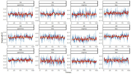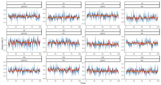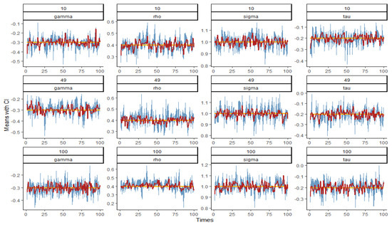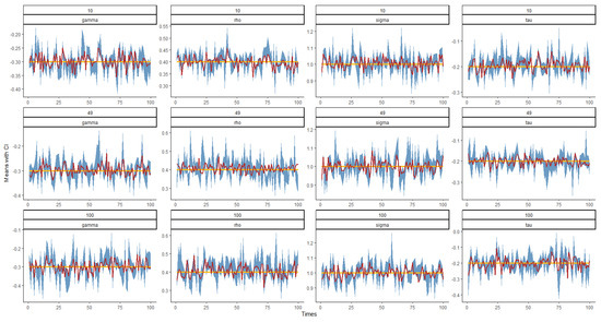 Figure 5, Figure 6, Figure 7 and Figure 8 show the graph of the mean value and confidence interval of each parameter in and under various combinations of and , where the blue area is the range covered by the 95% confidence interval, the red broken line is the mean of the parameter estimates, and the yellow line is the true value of the parameters. As can be seen from the figures, due to the small, estimated variances, the means fluctuate very little around the true values, and the ranges of confidence intervals are also relatively stable. In only a few cases, the confidence intervals do not cover the true values, and with the increase in and , the coverage degree becomes higher and higher, that is, the coverage probability (CP) gradually approaches 1.