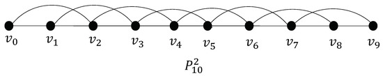 Theorem 5 gives that for , whereas Theorem 1 shows that . Thus, we obtain the result that the fault-tolerant metric dimension of the square of path is 4 when . In the below, we calculate the codes of each vertex for with respect to the fault-tolerant resolving set (Figure 1). The distance matrix D for has been given below.