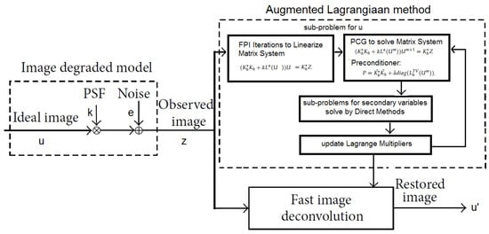 Particularly in astronomical images, image deblurring frequently requires that the restored image has precisely non-negative intensities [40,41,42,43,44]. However, it has been noted that solutions using current techniques may not always produce favorable outcomes. Images with many pixels having intensity values equal to or close to zero are known as images with negative intensities or black space. In this research, we provide a model for TFOV-based image deblurring that guarantees strictly positive outcomes for image intensities. The suggested model additionally restricts the image intensity values, maintaining them within a specified range. The removal of negative intensities or their confinement within the prescribed range also contributes to improving the quality of deblurred images. The main idea behind this paper is to convert the TFOV-based constrained image deblurring problem into an unconstrained one and then introduce the Lagrange multiplier. The optimization issues in computer vision and image processing have been successfully addressed by augmented Lagrangian methods [45,46,47]. Augmented Lagrangian methods have demonstrated superior speed compared to other numerical techniques. It has been demonstrated that the original nontrivial minimization problem can be broken down into a number of straightforward and quick-to-solve subproblems using augmented Lagrangian methods. Some of them have closed forms of solutions, while others can be quickly solved using tools such as the fast Fourier transform (FFT). In our augmented Lagrangian method, the solution of one of the subproblems requires the conjugate gradient (CG) method. However, the CG method exhibits slow convergence due to an ill-conditioned matrix system. To overcome the slow convergence problem of CG, we introduce a new preconditioned matrix in this paper.