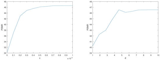 In this section, we use our algorithms to solve the unconstrained TFOV problem (5) and compare the results with the one-sided constrained problems (7) and (8) and two-sided constrained problems (17) and (18). We conduct several sets of experiments using different digital images. The algorithm code is written in MATLAB and all computational experiments are performed on an Intel Core i7-4510U CPU @2.60 GHz. To evaluate the quality of the restored image, we use the peak signal-to-noise ratio (PSNR) in decibels (dB) [59] and the structural similarity index measure (SSIM) [60]. A higher PSNR and SSIM value indicates a high quality of the restored image. The degree to which the algorithms satisfy the constraints is measured by counting the number of pixels with negative values for the one-sided constraint method and the number of pixels outside the range for the two-sided constraint method. To observe the optimum values of our initial parameters and d, we performed computations on the Barbara image. We observed numerically (see Figure 2) that the optimum ranges for the initial parameters and d of the augmented Lagrangian method are and , respectively. For our experiments, we choose The and . The values of and are chosen according to [39]. In all experiments, the stopping criterion for the numerical iterations is defined as , where is the solution vector in the k-th iteration. The results are presented in figures and tables.