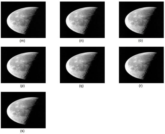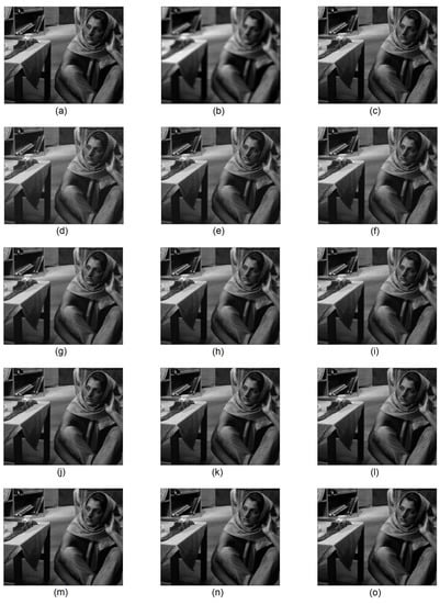 (a) is an exact image. (b) is a blurry image. (c) is a deblurred image by the unconstrained method. The images from (d–o) are deblurred by the OSCM according to iterations from to , respectively.