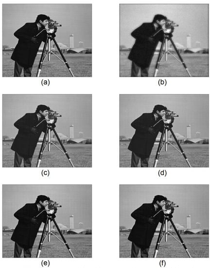 where . The Tikhonov model involves least-squares estimation, which often leads to excessively smoothed image reconstructions. As a result of its edge-preserving property, the total variation (TV) model [23,24,25] has become the most widely recognized non-linear energy minimization image deblurring model used for image deblurring.