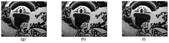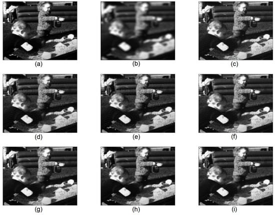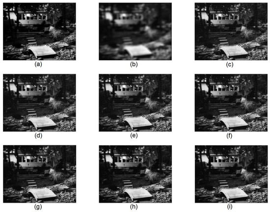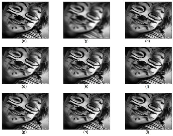 Image 4: (a) Exact image, (b) blurry image, (c) image deblurred by the TV method, (d) image deblurred by the OLM method, (e) image deblurred by the TLM, (f) image deblurred by the RLTV method, (g) image deblurred by the NFOV method, (h) image deblurred by the OSCM method, and (i) deblurred image by the TSCM.