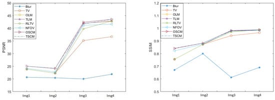 - From Figure 11, Figure 12, Figure 13 and Figure 14, and Table 6, it is evident that our methods, OSCM and TSCM, consistently produce better values for PSNR and SSIM when compared to all other methods. These results demonstrate the strong performance of the OSCM and TSCM, which consistently generate high-quality images. A comparison of PSNR and SSIM values for different methods using Levin’s dataset is depicted in Figure 15.