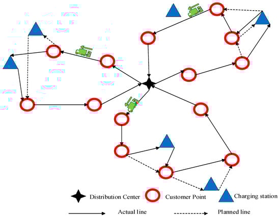 Electric vehicles have become the main force of end-delivery transportation because of their energy savings, low carbon emissions, and low noise levels [1,2]. The wireless communication network system equipped on electric vehicles can obtain real-time traffic information, accurately sense the road environment, and facilitate information interaction between vehicles, roads, and networks [3,4]. Due to their limited range, electric vehicles often require recharging, which necessitates finding a suitable location and time for recharging during delivery. The dynamic charging demand of other vehicles often affects the queuing and waiting time of electric logistics vehicles. As a result, electric vehicles waste a lot of time waiting to charge. This not only affects distribution efficiency but also increases the total cost. Therefore, the introduction of intelligent network connection technology in electric vehicle distribution is conducive to giving full play to the advantages of both and improving the efficiency of distribution. Therefore, it is practical to study the charging queuing problem of intelligent, net-connected electric vehicles.