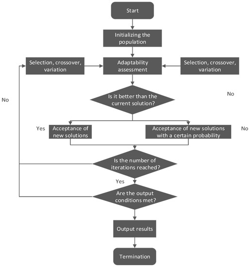 The temperature decay coefficient is randomly taken in the interval [0.7, 1], and the iteration is completed when the initial temperature drops to the thermal equilibrium condition, i.e., the termination temperature , and the final result is output; in the inner loop, the temperature is fixed and the operation is terminated when the number of iterations reaches a specified number. In addition, the length of the Markov chain set in this paper is 1000. The flow chart is shown in Figure 4.