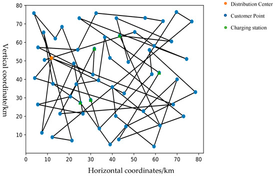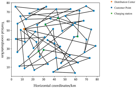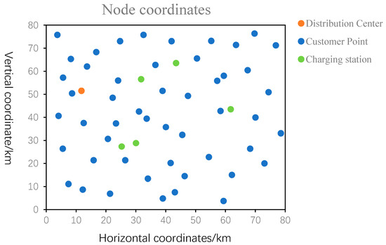 In order to better reflect the actual situation, the number of electric vehicles in the region is simulated based on the density of customer points. The region is divided into several small areas of 2 km × 2 km [25], with two new energy vehicles assigned to each small area. The number of additional electric vehicles is then determined based on the number of customer points. For example, if there are two customer locations in Area A, the number of EVs is the base quantity of two plus the additional quantity of two, for a total of four. Since the model usually uses the straight-line distance as the road distance between nodes, this practice deviates from the actual situation. Therefore, the road detour factor σ (σ = 1.2) is chosen for this example. The node distribution of distribution centers, customer points, and charging stations in the example is shown in Figure 5 (in order to show the node distribution more intuitively and clearly, the figure is enlarged 100 times. This means that one unit calculated in the figure represents 0.1 km).