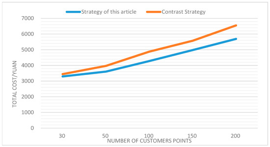 By analyzing the experimental results in Table 3, we find that time cost accounts for the highest proportion of the overall distribution cost; therefore, reducing the time cost of EV is the key to improving the total cost of logistics and distribution. In order to illustrate the effectiveness of this paper’s strategy, we compared the total cost of the two strategies for different customer sizes, as shown in Figure 8. It can be found that the total cost under both strategies grows with the number of customer points, and this paper’s strategy is better than the latest charge strategy in reducing the distribution cost, mainly because this paper’s strategy predicts the traffic flow in the region and considers the charging probability of other vehicles so as to choose a better route for electric vehicles with charging stations. Moreover, as the number of customer points increases, the difference between the two becomes larger.