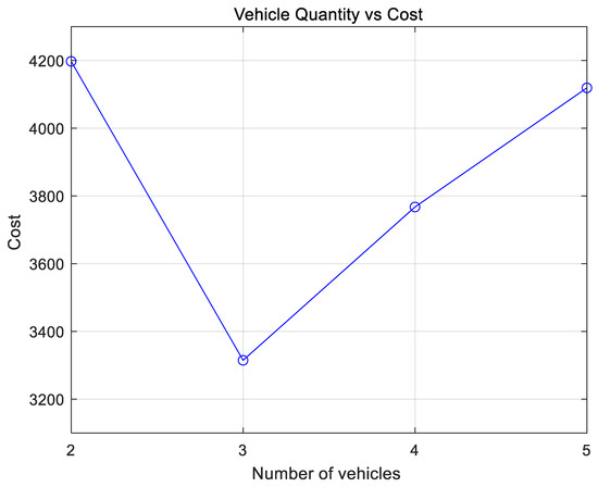To further verify the effectiveness of the strategy in this paper, the total cost of different numbers of EVs under intelligent network connection strategy is investigated with a customer size of 50 and all other conditions being equal, as shown in Figure 9. By comparing the total costs for different numbers of vehicles, it can be seen that for a customer point count of 50, the choice of three electric vehicles increases the fixed vehicle cost but minimizes the total cost of operation during the delivery process.