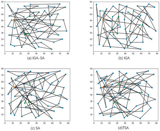 To verify the effectiveness of the algorithm in this paper, the Improved Genetic Algorithm-Simulated Annealing (IGA-SA), it is compared with the Improved Genetic Algorithm (IGA), Simulated Annealing (SA), and Tabu Search Algorithm (TSA). The charging waiting time is set to 0.5 h uniformly. The results of the four algorithms are shown in Figure 10 and the experimental results are shown in Table 4. In terms of cost, the algorithm IGA-SA used in this paper reduces distribution cost and improves logistics and transportation efficiency compared with the other three algorithms; in terms of computation time, the algorithm in this paper outperforms TSA at the speed level, improves computation efficiency, and outperforms IGA and SA at the local search and global convergence levels to obtain optimal results in a shorter period of time.