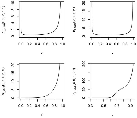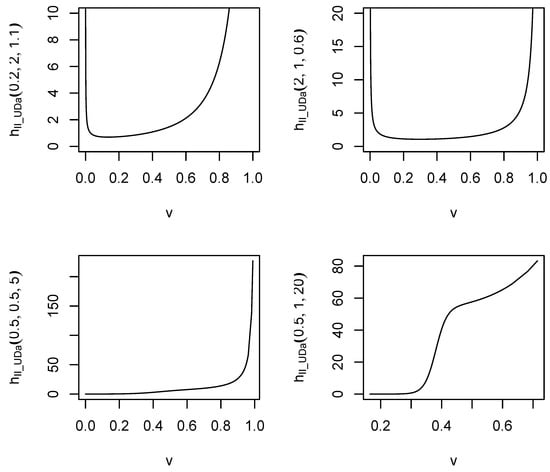 - is an increasing monotonic function:Moreover, let be the p-th quantile of Y, with . It is easy to verify that, from (2), the q-th quantile of V is as follows:with .The general expressions for and functions are, respectively, given by: