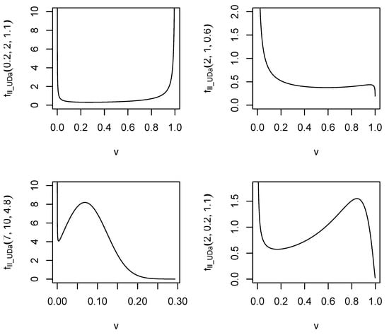 We should note that most of the proposals in the literature can be thought of as particular cases of the comprehensive framework described earlier. For example, the most used transformations in the cases of positive rvs are as follows: and . On the other hand, the most common transformation, when Y assumes a real value, is , as in the case of the logit slash model. Moreover, was used in the context of non-monotonic rv transformations to obtain the arcsecant hyperbolic normal model, which, strictly speaking, does not belong to the general framework proposed here, but it can be used in every case with small mathematical expedients. We should note that, in general, any distribution function can be used to transform Yrv in a new variable . Table 1 summarizes a classification of some unit distributions proposed in the literature, according to the used transformation.