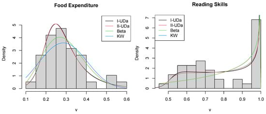 In this section, we consider the proportion of income spent on food and the scores regarding reading accuracy. The corresponding empirical distributions are shown in Figure 5. To evaluate the adequacy of the proposed models in describing the considered data, the maximum likelihood estimates (MLEs) of the parameters for the I-UDa and II-Da densities reported in (14) and (23) are obtained, along with the corresponding standard errors and the values for the Akaike information criterion (AIC). Moreover, we compare the obtained results with the analogs for the beta and Kumuraswamy (KW) models, which are likely the most used models for data on bounded support. Table 2 presents the obtained results. Both the AIC values and the inspection of Figure 5 suggest that the proposed models better describe the considered data if compared with the beta and KW distributions. In particular, the lower value of the AIC for food expenditure data is obtained in correspondence with the type II unit-Dagum model, while, for reading skills data, the type I unit-Dagum reaches the lower result, far from the beta and KW ones. We should note that the chosen data are very different from each other in terms of the distribution shape, so these examples give us the possibility of testing the flexibilities of our models and their ability to properly reproduce different characteristics of the phenomena, such as unimodality, increasing density, presence of asymmetry, fat tails, and so on.