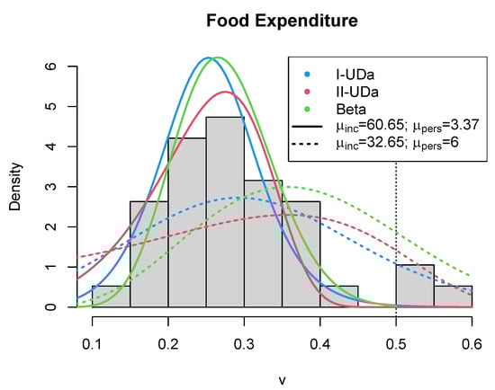 For the first dataset, information on household income and the number of people living in the household are available. Starting with the reparameterization data reported in (19) and (28), we consider the effect of these covariates on the median and 90th quantile, according to the regression models described in Section 5. Since both the indicators assume values in the unit interval, a logit-link function is used to relate the median and 90th quantiles to the covariates. Moreover, we consider an intercept term related to the indicator through a log-link function, which is suitable for positive indicators. The ML estimates of the coefficients, their standard errors, and results from the Wald test are reported in Table 3. In both models, we find that the median and 90th quantiles of the proportions spent on food decrease as income increases, while the number of persons living in a household shows a positive significant effect on the 90th quantile, ceteris paribus. Moreover, both models outperformed the beta regression in terms of AIC (−88.37 for beta regression), with the best results obtained for II-UDa regression. A comparison between empirical and fitted curves reported in Figure 6 confirms these results. In particular, here, two different curves are shown for each model. Indeed, through the regression approach and the resulting estimates, it is possible to consider the behaviors of density functions for different covariate values. The depicted curves refer to the median and indicators for the I-Da and II-Da model, and to the mean and dispersion parameters for the beta model, when income and the number of persons are equal to the average level observed for and , respectively (; vs. ; ). This allows us to evaluate the ability of the models to describe the right distribution tail, as well as the central tendency.