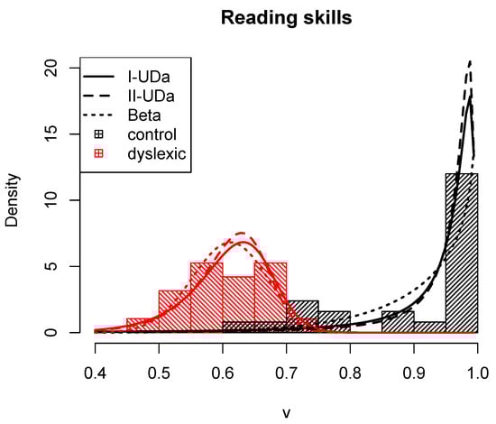 In this case, the model with the best performance in terms of AIC is the I-Da one, but both of the proposed models show lower values than the beta regression (AIC = −117.8). Figure 7 shows the comparisons among empirical and fitted distributions for dyslexic and non-dyslexic subjects, considering an average iq level that is equal to −0.653 for dyslexic subjects and 0.4966 for control subjects.