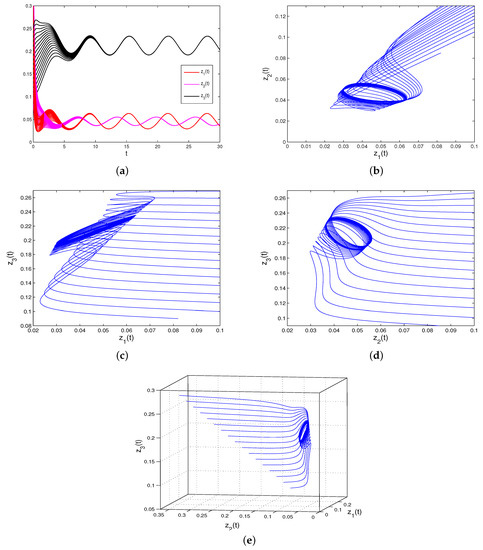 Obviously, in system (28), the assumptions of Theorem 3.1 in [21] do not hold. If , then the assumptions of Theorem 3.1 in [21] are satisfied, and the assumptions of Corollary 3 are also satisfied. Therefore, it can be seen that our obtained results are more general than the results in [21].