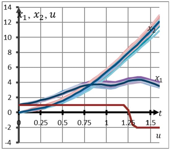 Figure 4 shows the trajectories and of the system and the optimal control for the case . It is possible to notice the result of the influence of random external conditions on the controlled system: small fluctuations of trajectories in the bundles and are visible. Also, Figure 4 shows the spread of trajectories at the end of the system operation time. Based on the numerical result shown in Table 6, the spread of trajectories decreases as information about coordinates is added to the control function. Similarly to the previous example, it can be shown that the largest spread is achieved when calculating program control and the smallest when calculating control with full feedback. In addition, with the increase in the number of coordinates of the state vector used in the control law, the value of the functional (4) decreases. The time spent executing the program is one second.