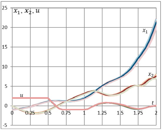 For example two, the problem statement is indicated in Table 3, the average value of the control quality criterion (3) was minimized. From a practical point of view, it is advisable to calculate all types of control laws, namely: open-loop control , control with incomplete feedback , , and control with full feedback . As a result of the algorithm, when calculating all types of control, the scales of truncation in time and for each coordinate of the state vector, respectively, as well as coefficients in the decomposition (10) according to the system of basic functions, the system of cosine (11) was chosen. The results are listed in Table 4.