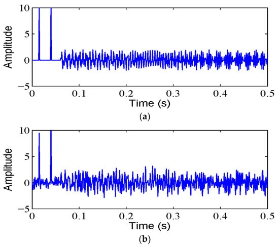 In this section, we consider a synthetic multicomponent signal composed of two impulses at 0.015 s and 0.04 s and one chirp and one modulation sinusoid between 0.06 s and 0.5 s, as shown in Figure 1a, to illustrate the improvements brought by frequency-domain SST in comparison with the traditional STFT and FSST methods. The TFRs provided by STFT, FSST, FDSST, and FDSST2 are displayed in Figure 2a–d. It can be seen that STFT suffers from a poor time–frequency resolution owing to its fixed window function. FSST performs better than STFT since it squeezes the time–frequency coefficients in the frequency direction; however, the frequency squeezing also leads to time–frequency energy diffusion in time. FDSST is characterized by better time localization compared with the STFT and FSST methods, but it has relatively poor frequency resolution. The FDSST2 result clearly illustrates its improvement over FDSST for representing the whole signal. The resolutions in both time and frequency are greatly improved.