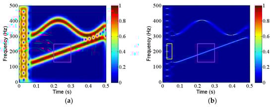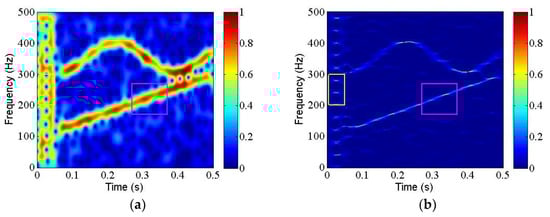 In the real world, nonstationary signals exist widely in different forms, such as seismic waves, radar signals, and communications and sonar systems [1,2,3,4,5]. Time–frequency analysis (TFA) is a powerful tool for the analysis of nonstationary signals when a one-dimensional signal of time can be mapped into a two-dimensional signal of time and frequency, which makes it feasible to characterize the time–frequency information [6]. The most common time–frequency analysis algorithms are the short-time Fourier transform (STFT) [7] and continuous wavelet transform (CWT) [8]. However, because of the Heisenberg uncertainty principle, such transforms fail to obtain a satisfactory time–frequency representation (TFR) result. In addition, the STFT is more affected by different types of window functions, and the width of the window function directly relates to the time–frequency resolution. Despite the variable resolution by means of a wavelet family, the CWT cannot enhance time and frequency resolutions simultaneously [9,10,11]. The Wigner–Ville distribution (WVD) [12], a quadratic algorithm, improves the readability of a TFR by concentrating the energy density in the time–frequency plane, but the cross-terms that exist in the energy distribution of the WVD when coping with multicomponent signals hinder its further application in practice.